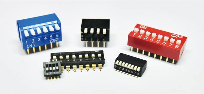 指撥開關 (DIP SWITCH)又名程式開關,應用於印刷電路板上,功能為調整電子設備的特性。一般常見的腳距為2.54mm,體計較大,隨著科技進步、設備儀器縮小,更有IC型、旋鈕型,甚至是腳距1.27mm的款式。科奕將提供最全面的規格選擇、最完美的產品品質供您選擇。